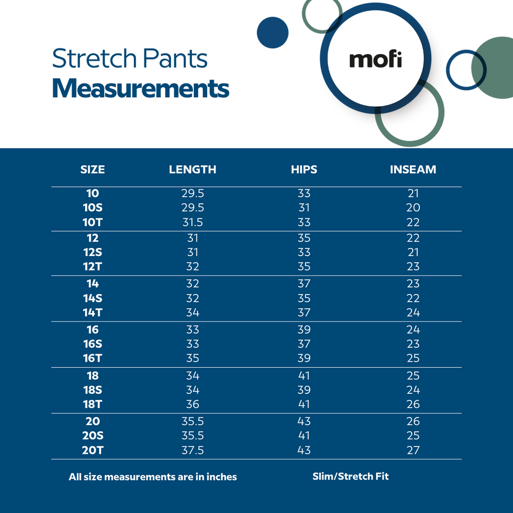 Our black stretch pants are the perfect everyday pants for school, play or relaxing. With an adjustable waist and a comfortable soft stretch these will be your go to pair of casual pants. 2 inch hidden hem in cuff.