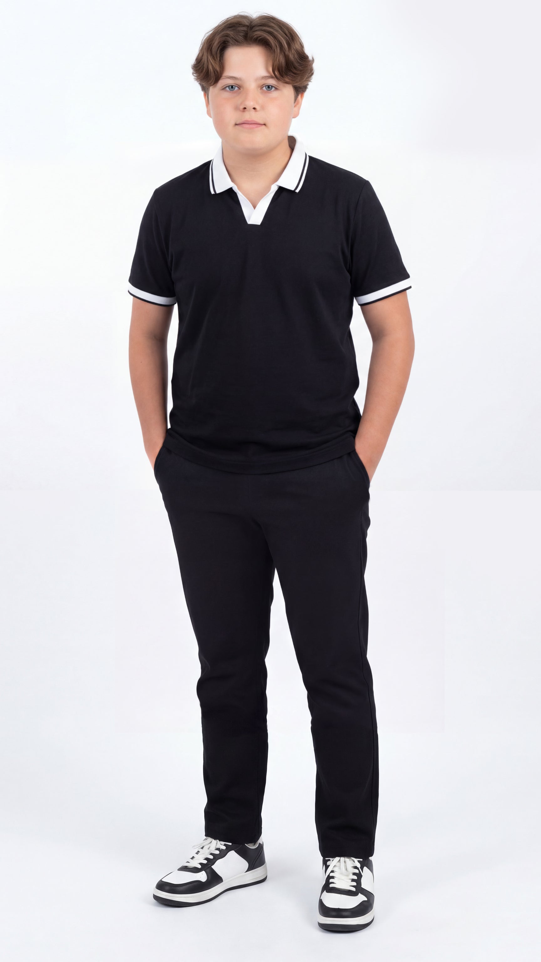 Crafted for comfort and durability, this polo ensures a cool and confident look for any occasion. The white trim adds a sophisticated touch, making it a standout piece in his collection. Keep your young trendsetter on point with the Black Johnny Collar Polo – where classic meets contemporary in a burst of brilliance!