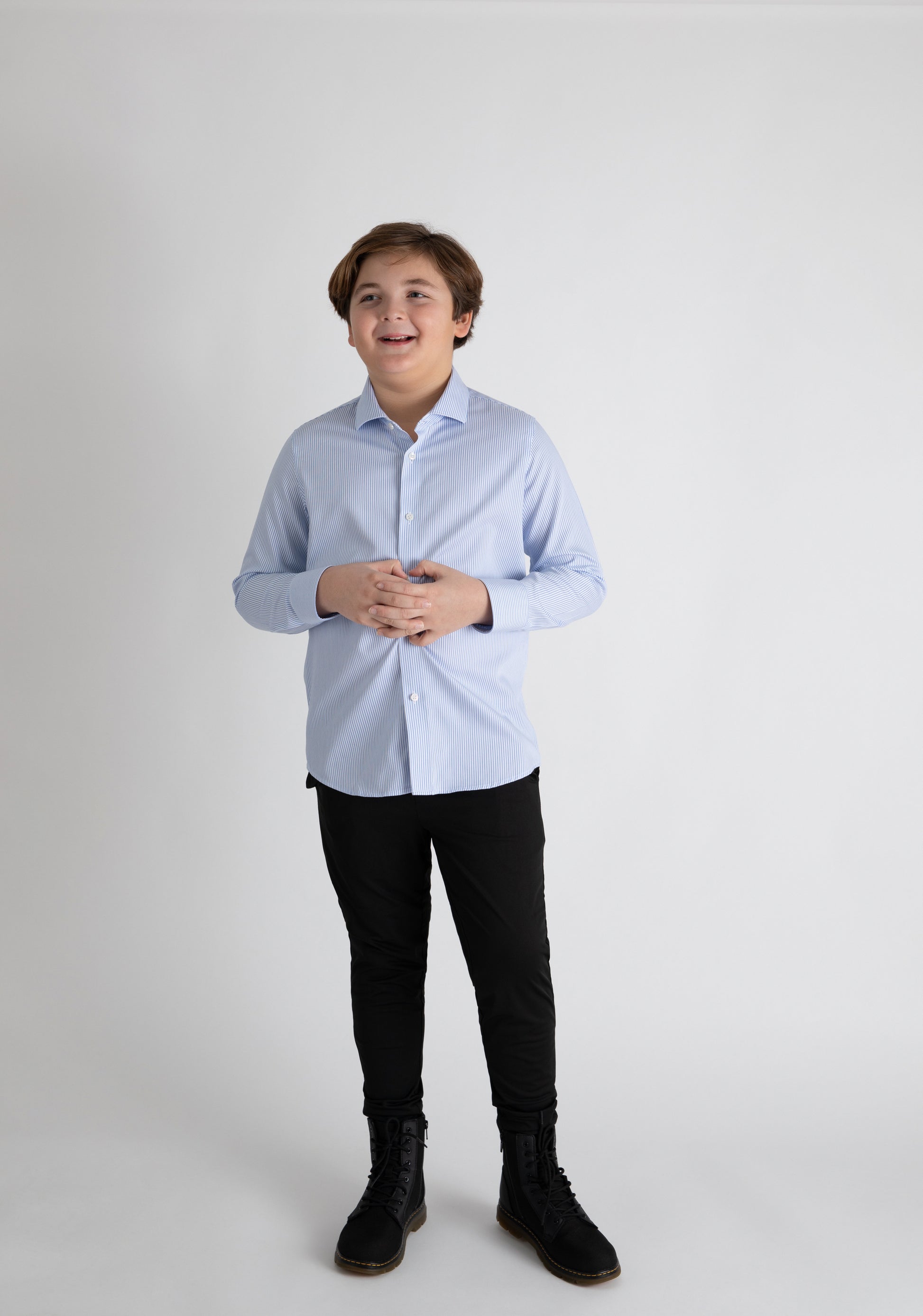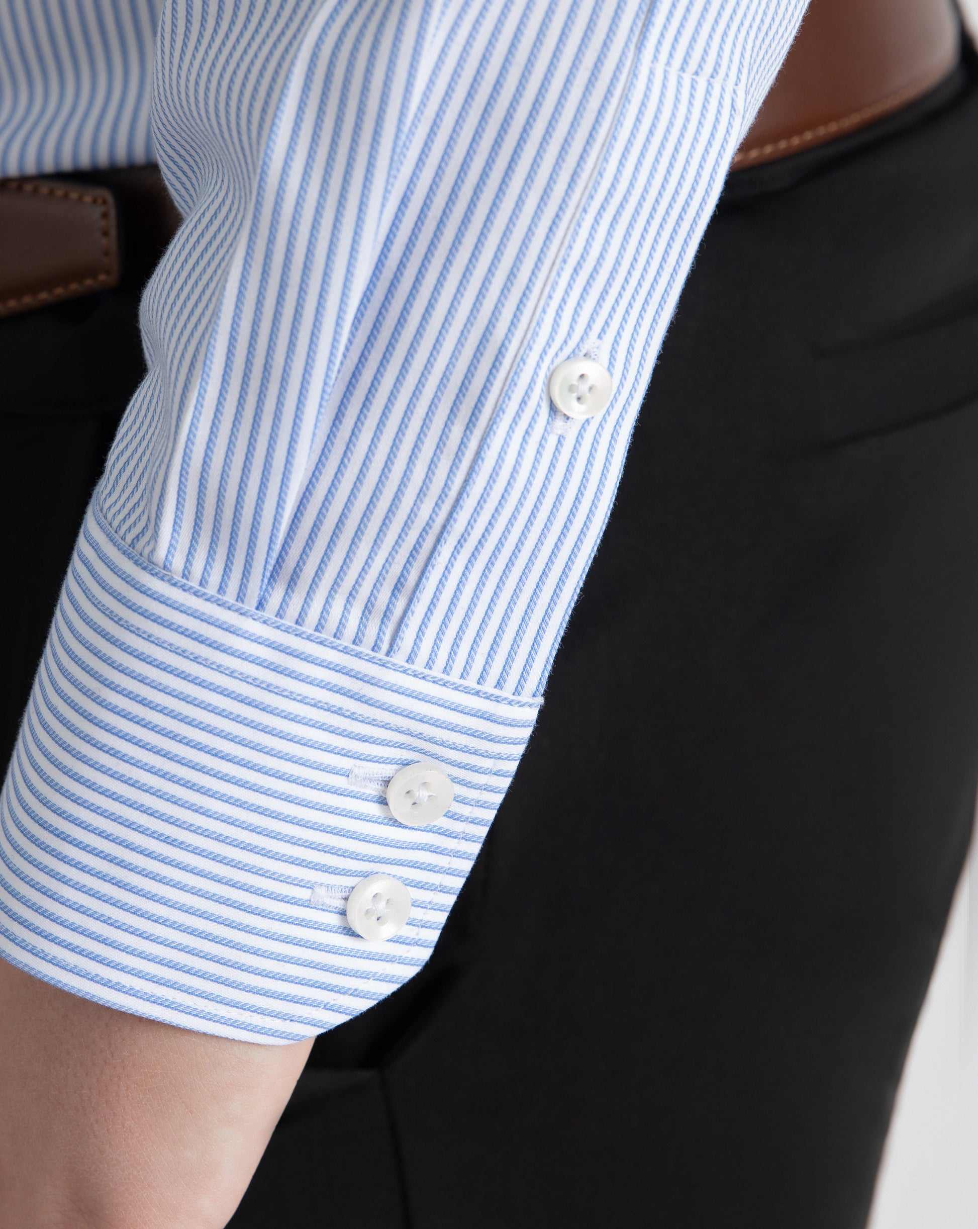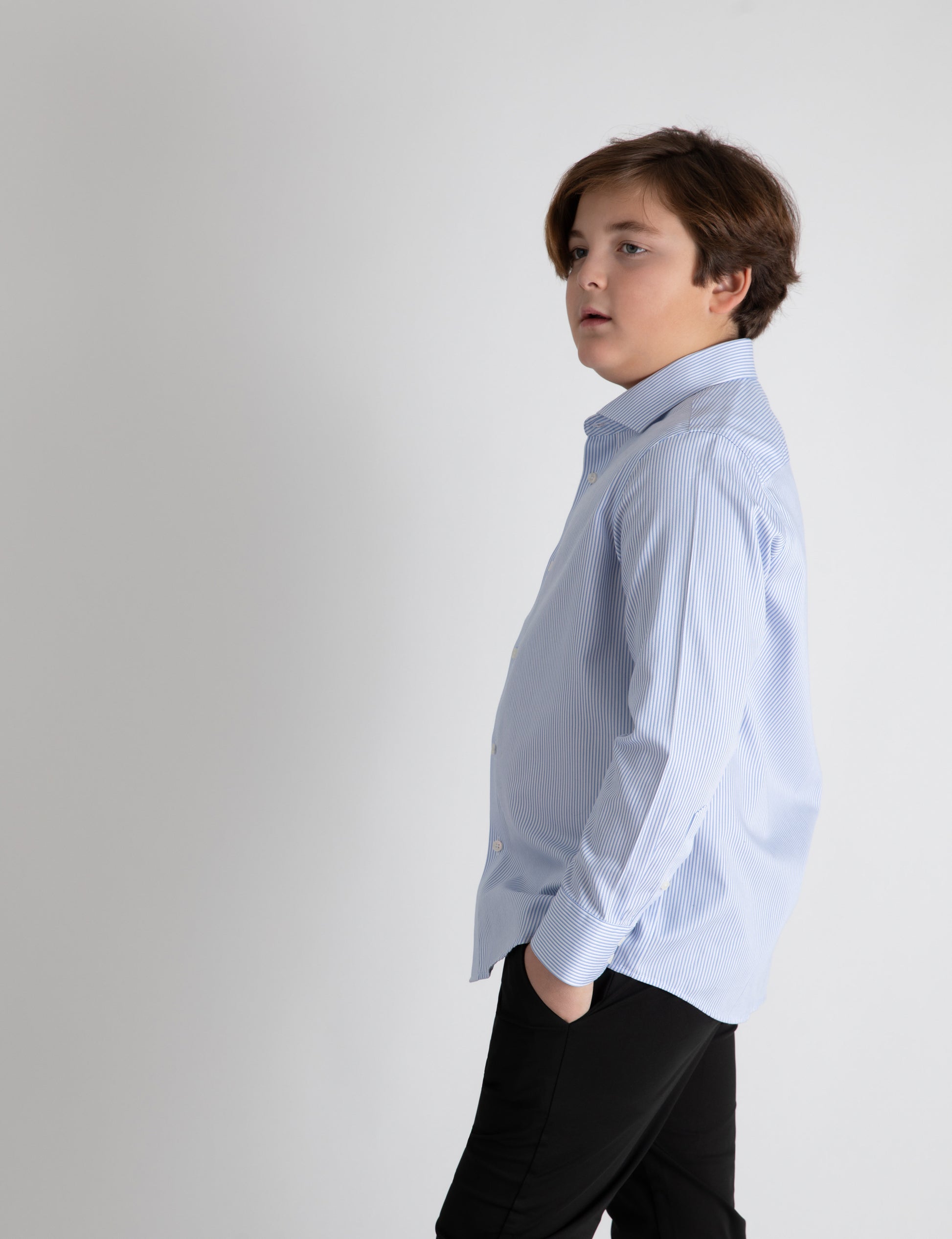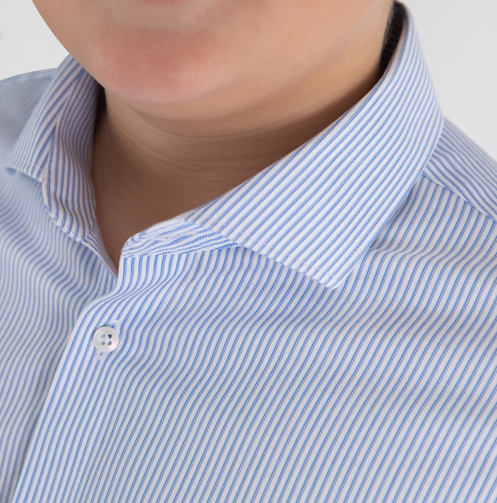 This dapper white and blue pinstripe dress shirt is tailored from 100% cotton making it comfortable and formal. With clear buttons and a cutaway collar this shirt can be worn with any blazer, cardigan or even on its own its a show stopper.
