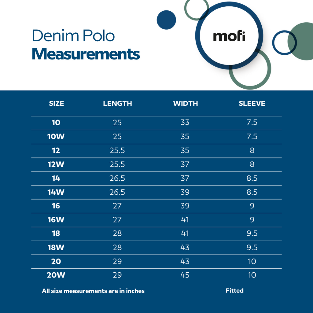 Our denim polo is made from a soft cotton/spandex blend for a comfortable fit with a very little stretch. With a spread collar, 4 buttons and 2 side slits, this polo was designed to keep you covered even when jumping with your hands up.