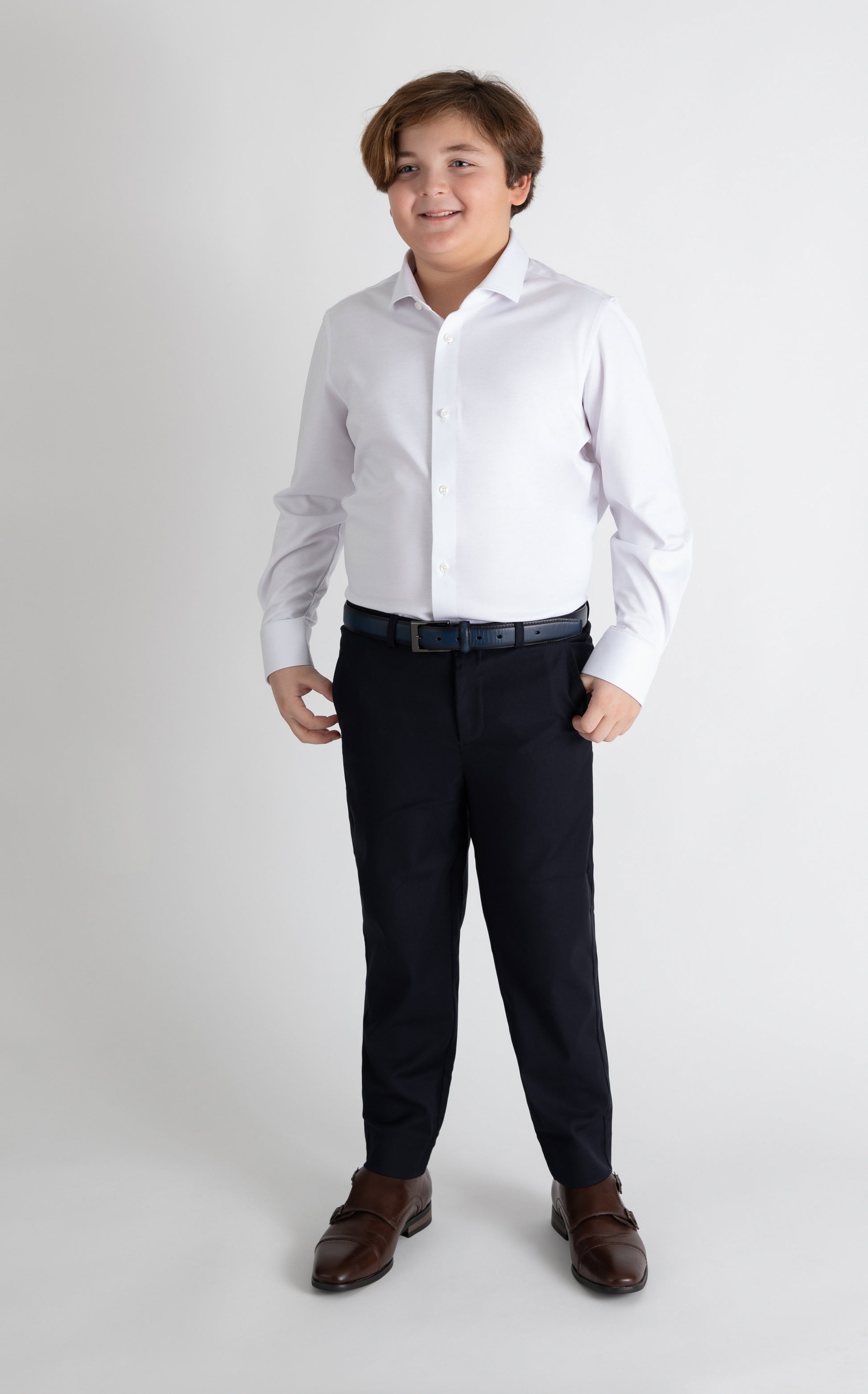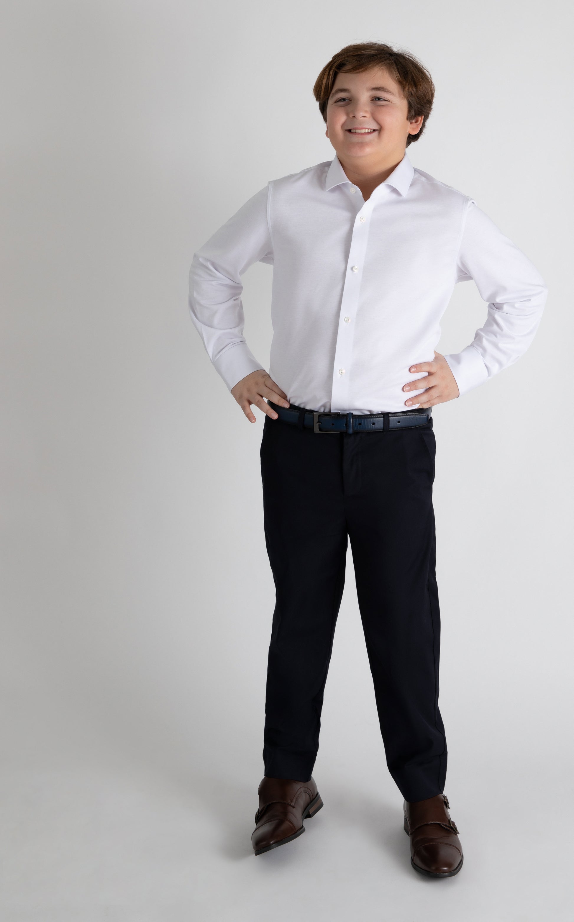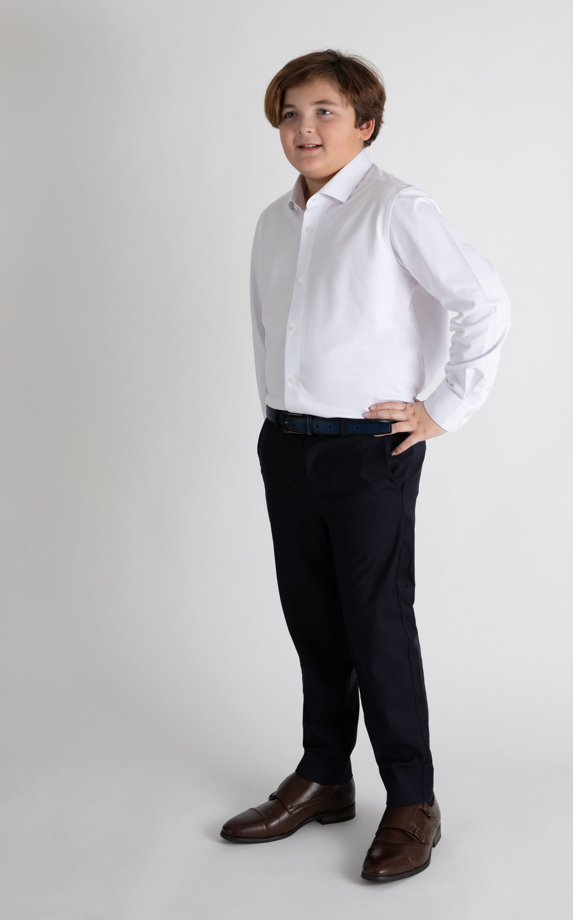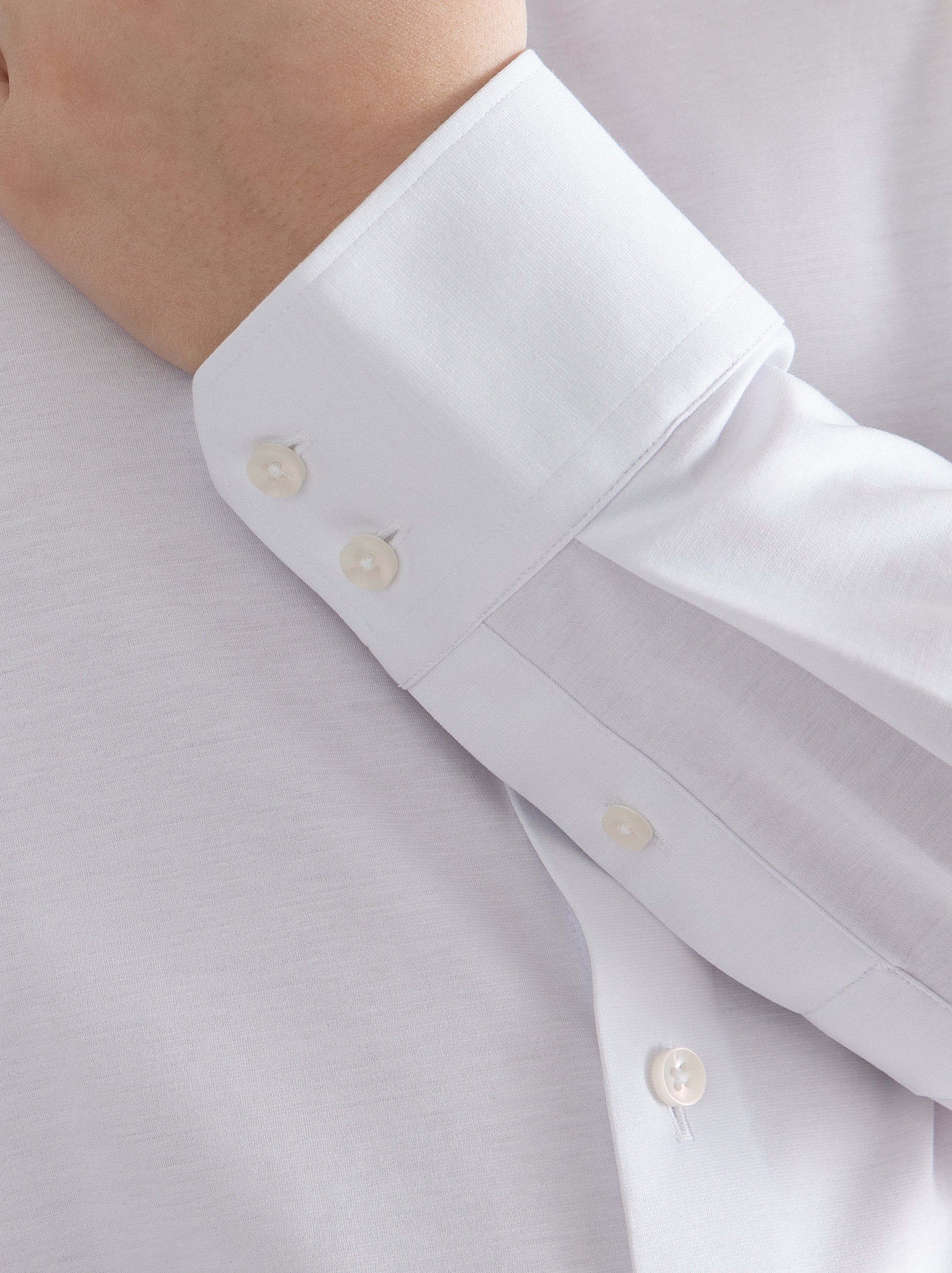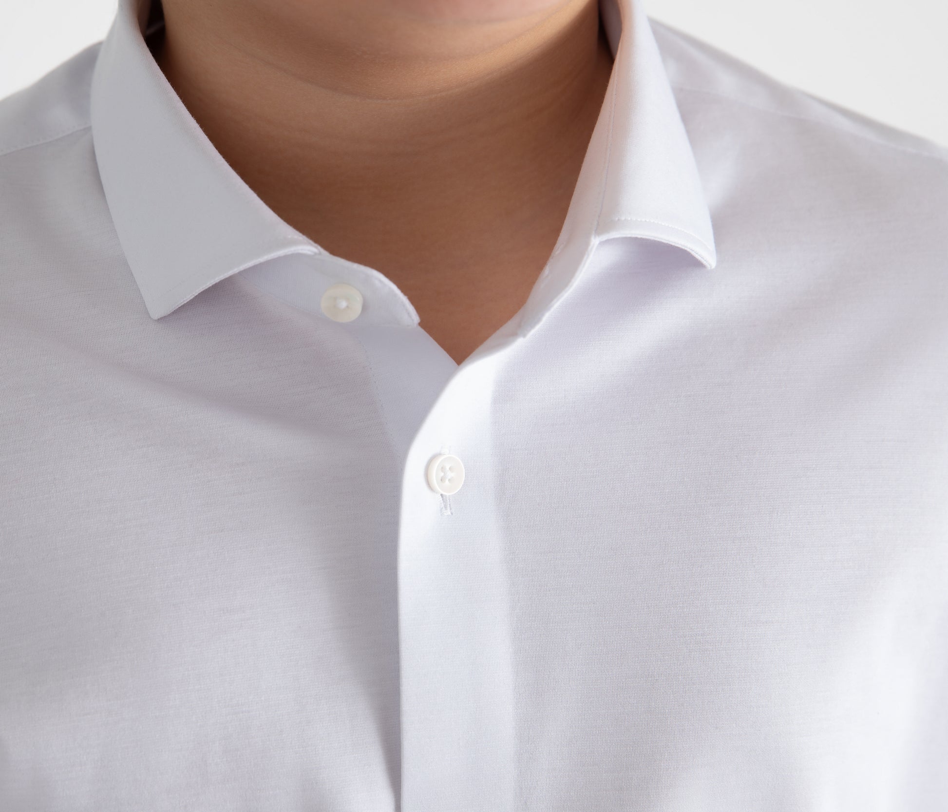 This dapper white knit dress shirt is tailored from a soft cotton blend making it comfortable and formal. With clear buttons and a cutaway collar this shirt can be worn with any blazer, cardigan or even on its own its a show stopper.